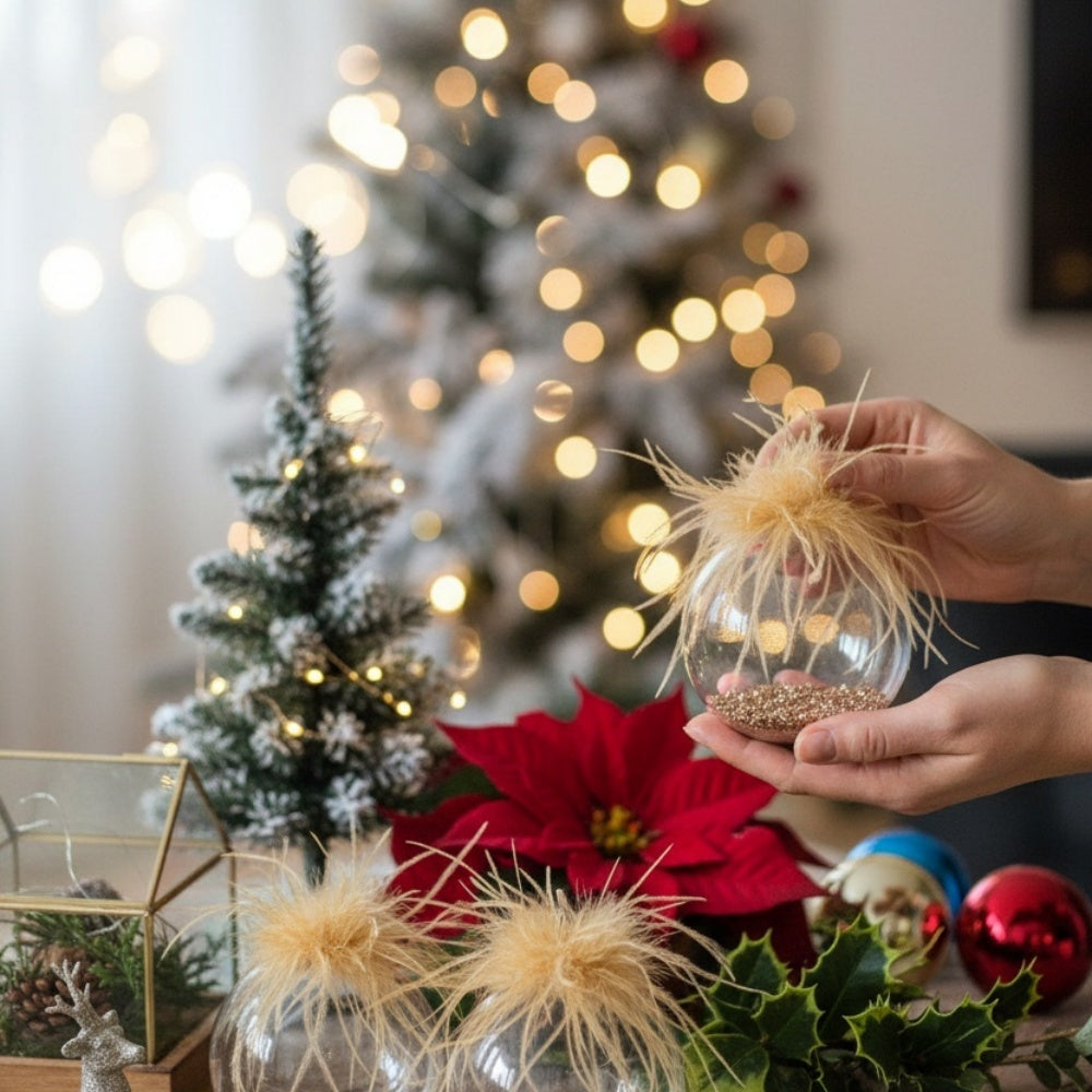 This coordinated four-piece set creates a perfectly balanced and upscale look across your Christmas tree, mantel garlands, wreaths, or tabletop displays. Their classic round silhouette, paired with a modern glitter texture, makes them adaptable to any décor theme — from traditional luxury to contemporary minimalism.